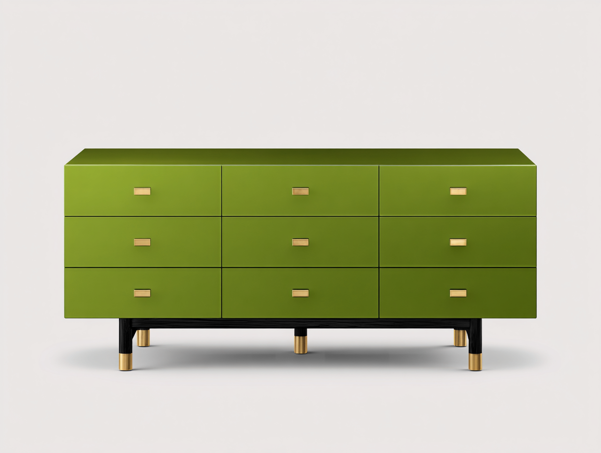 Diese moderne Kommode überzeugt durch ihr klares Design und die auffällige grüne Farbgebung. Sie bietet großzügigen Stauraum und setzt gleichzeitig einen stilvollen Akzent in Wohn- oder Schlafzimmern.