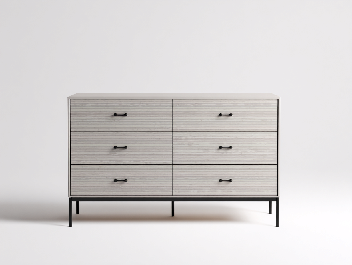 Die Kommode verfügt über sechs geräumige Schubladen, die eine übersichtliche Organisation ermöglichen. Die leichtgängigen Schubladenführungen bieten hohen Bedienkomfort im Alltag. Die erhöhte Bauweise erleichtert die Reinigung unter dem Möbelstück und sorgt für bessere Luftzirkulation.