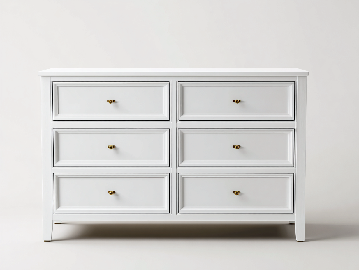 Gefertigt aus hochwertigem MDF-Holzwerkstoff mit glatter, pflegeleichter Oberfläche in Weiß. Die dekorativen Rahmenfronten verleihen der Kommode eine hochwertige Optik. Stabile Metallgriffe in Goldoptik setzen dezente Akzente und runden das Gesamtbild ab. Die sorgfältige Verarbeitung sorgt für Langlebigkeit und Stabilität.