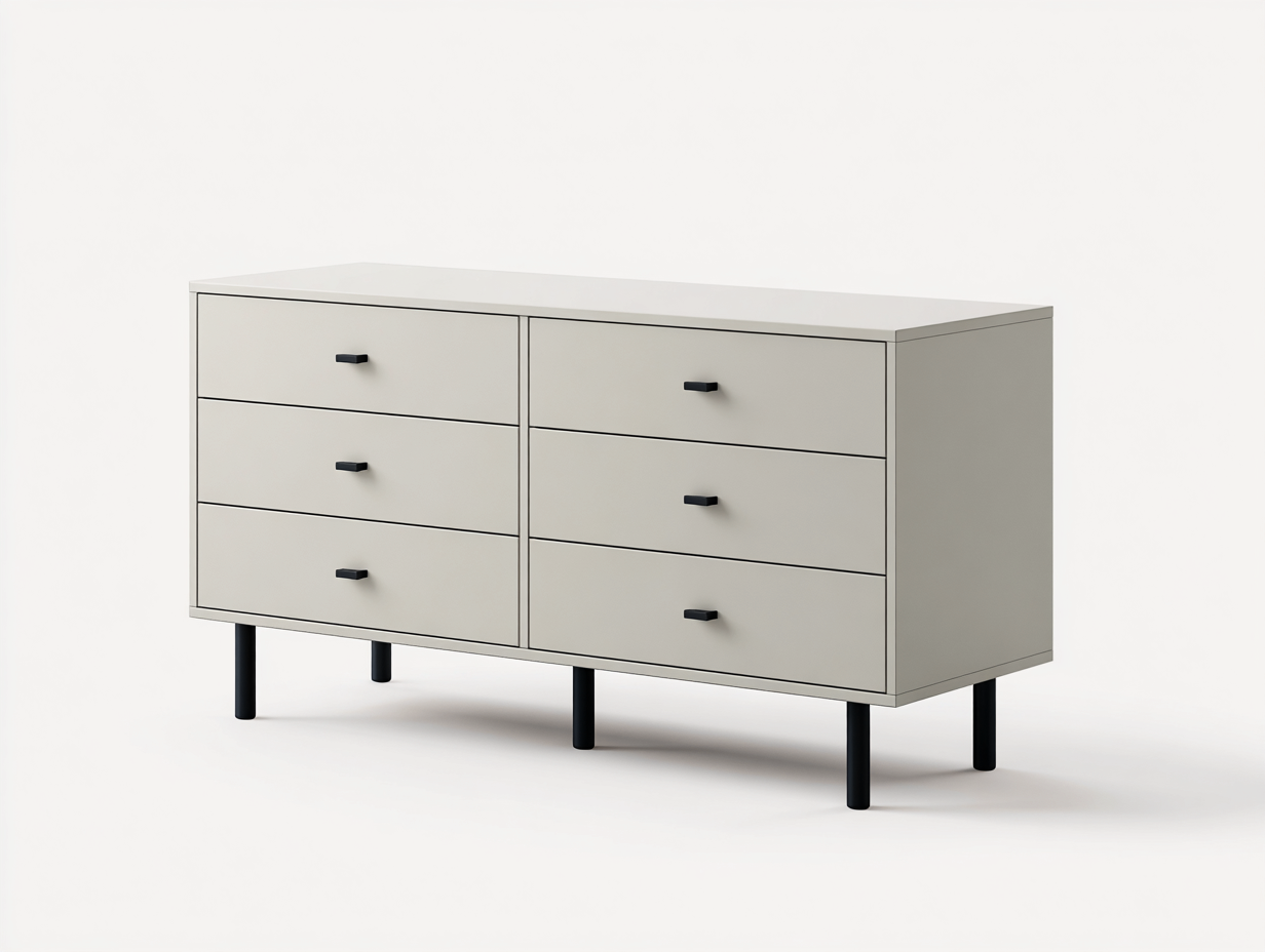 Die Kommode verfügt über sechs geräumige Schubladen, die eine strukturierte und übersichtliche Aufbewahrung ermöglichen. Die leichtgängigen Schubladen sorgen für komfortable Handhabung im Alltag. Die erhöhte Bauweise erleichtert die Reinigung unter dem Möbelstück.
