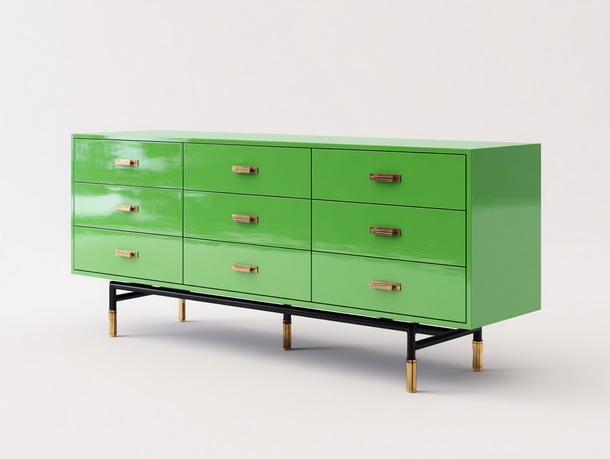 Diese moderne Kommode in auffälligem Grün mit Hochglanzoberfläche bringt frische Akzente in jeden Wohnraum. Sie eignet sich ideal für Wohnzimmer, Schlafzimmer oder Essbereiche und bietet großzügigen Stauraum für Kleidung, Geschirr oder Alltagsgegenstände. Das schlanke Metallgestell verleiht dem Möbelstück eine elegante, leicht wirkende Optik.